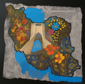 در مرکز اثر، نمادی شاخص از معماری ایران (برج آزادی) قرار گرفته که با رنگ‌های زیبا و چشم نوازو گل‌های سنتی تزیین شده.